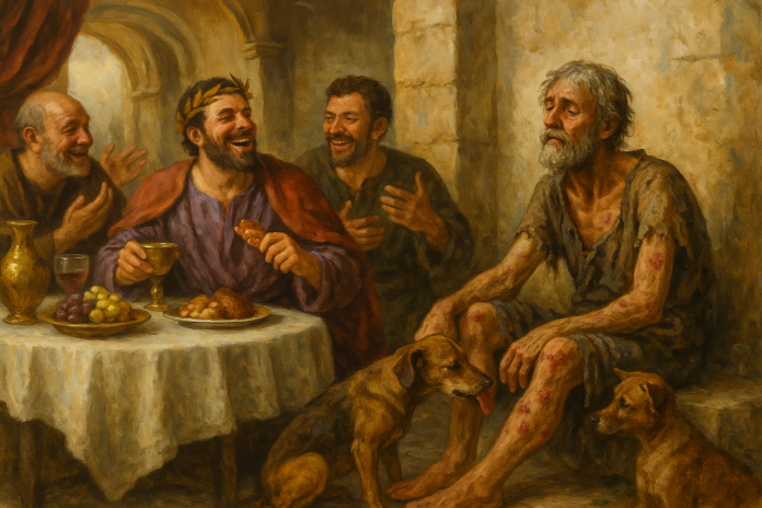 Sekali peristiwa Yesus berkata kepada orang-orang Farisi, ”Ada seorang kaya yang selalu berpakaian jubah ungu dan kain halus, dan setiap hari ia bersukaria dalam kemewahan. Dan ada seorang pengemis bernama Lazarus, badannya penuh dengan borok, berbaring dekat pintu rumah orang kaya itu, dan ingin menghilangkan laparnya dengan apa yang jatuh dari meja orang kaya itu. Malahan anjing-anjing datang dan menjilat boroknya.