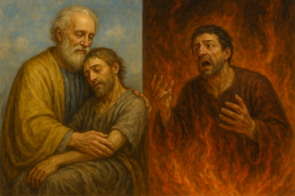 Kemudian matilah orang miskin itu, lalu dibawa oleh malaikat-malaikat ke pangkuan Abraham. Orang kaya itu juga mati, lalu dikubur. Dan sementara ia menderita sengsara di alam maut ia memandang ke atas, dan dari jauh dilihatnya Abraham, dan Lazarus duduk di pangkuannya. Lalu ia berseru, katanya: Bapa Abraham, kasihanilah aku. Suruhlah Lazarus, supaya ia mencelupkan ujung jarinya ke dalam air dan menyejukkan lidahku, sebab aku sangat kesakitan dalam nyala api ini.