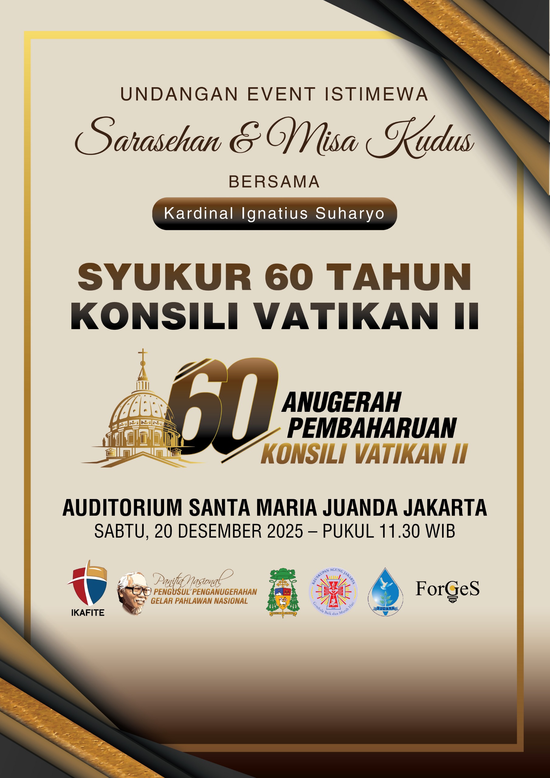 Kami mengharapkan konfirmasi kehadiran dan pendaftaran Bapak/Ibu/Saudara-i pada acara Saresehan dan Misa Kudus dalam rangka : “Syukur Anugerah 60 Tahun Konsili Vatikan II”, yang akan kami selenggarakan pada hari : *Sabtu, 20 Desember 2025 ; Jam 12.00 – 17.00 WIB* ; bertempat di Auditorium Kampus Ursulin Santa Maria Jakarta, Jl.Ir.H.Juanda 29 – Jakarta Pusat.
