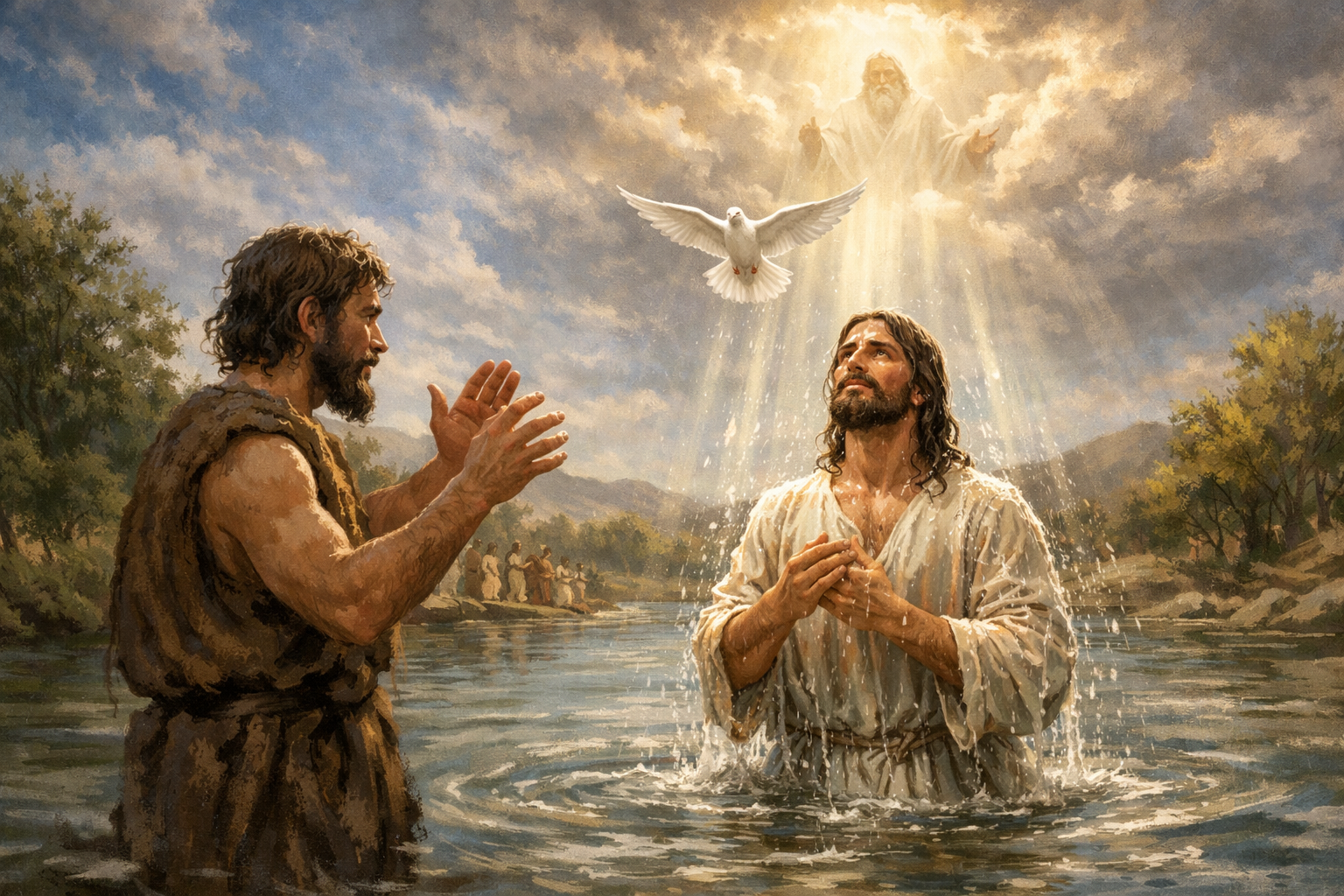 Sesudah dibaptis, Yesus segera keluar dari air dan pada waktu itu juga langit terbuka dan Ia melihat Roh Allah seperti burung merpati turun ke atas-Nya, lalu terdengarlah suara dari sorga yang mengatakan: ”Inilah Anak-Ku yang Kukasihi, kepada-Nyalah Aku berkenan.””