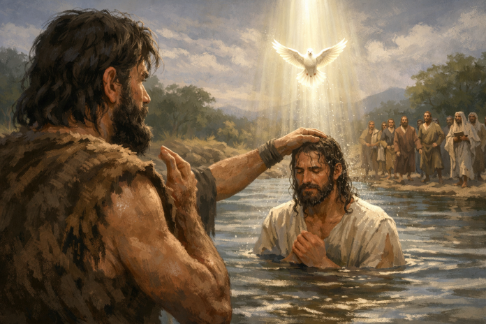 Ketika Yohanes membaptis di Sungai Yordan, ia melihat Yesus datang kepadanya dan ia berkata: ”Lihatlah Anak domba Allah, yang menghapus dosa dunia. Dialah yang kumaksud ketika kukatakan: Sesudah aku akan datang seorang, yang telah mendahului aku, sebab Dia telah ada sebelum aku. Dan aku sendiri pun mula-mula tidak mengenal Dia, tetapi untuk itulah aku datang dan membaptis dengan air, supaya Ia dinyatakan kepada Israel.”