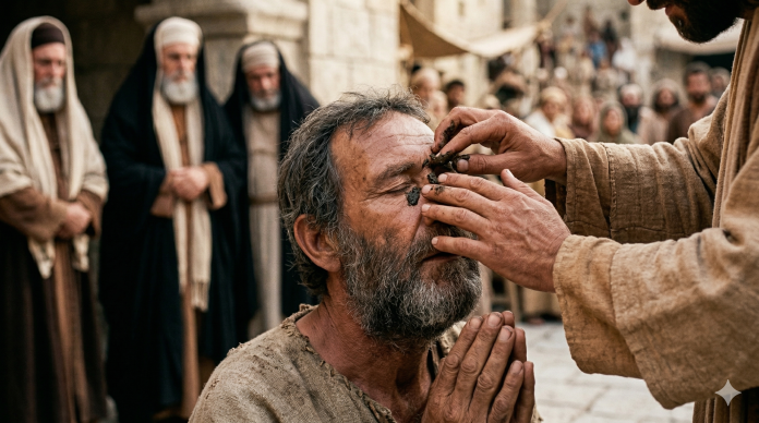 Maka Yesus datang — tanpa diminta, berinisiatif sendiri, seperti Allah yang selalu mendahului. Dari debu tanah Ia menciptakan mata yang belum pernah ada, seperti dulu Ia membentuk Adam. Orang itu tidak sekadar disembuhkan. Ia dicipta kembali. Ia lahir untuk kedua kalinya.